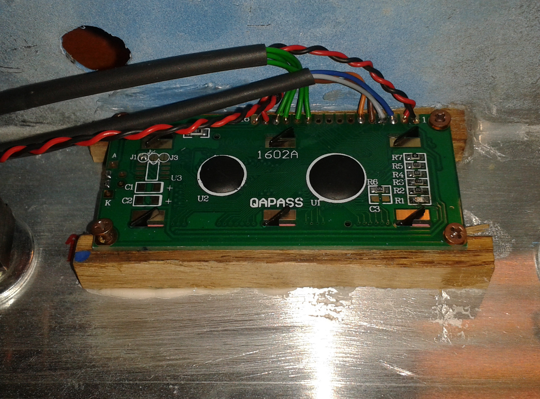 Per il display ho usato un pezzo di plexiglass come protezione e due pezzettini di legno incollati allo chassis per poterlo avvitare, questo e` il risultato