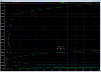 Come si può notare da esso, la curva di VG1 a -18V sta un pò più sotto del punto di lavoro scelto. Per essere precisi, se prendiamo come punto fisso 350V sulle X, avremmo circa 50 mA anzichè 54mA. Con altre librerie sempre della 6l6gc, ho avuto anche differenze maggiori.