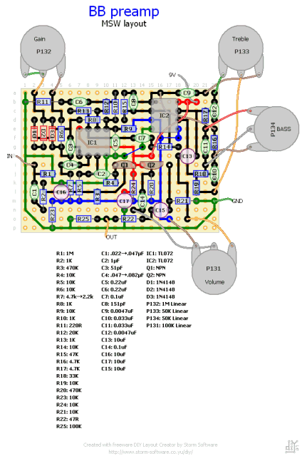 Salve a tutti, ho seguito lo schema allegato per realizzare questo bell'overdrive.. però attualmente non mi soddisfa e gradirei qualche indicazione per renderlo più dinamico (con pot della chitarra a basso volume) per qualche taglio di frequenze diverso o comunque qualcosa che lo renda più originale e magari moderno come sonorità.. attendo proposte, grazie.. :)