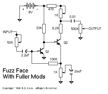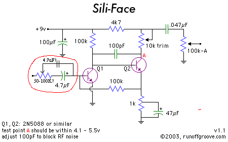 Ho trovato la modifica al ff di Fuller! A prte le differenze col sili face, il pot in basso e da 1 k anke qui, nn da 10k? La resistenza iniziale del sili face è cmq di 1k, posso toglierla e inserire un pot da 10k?!