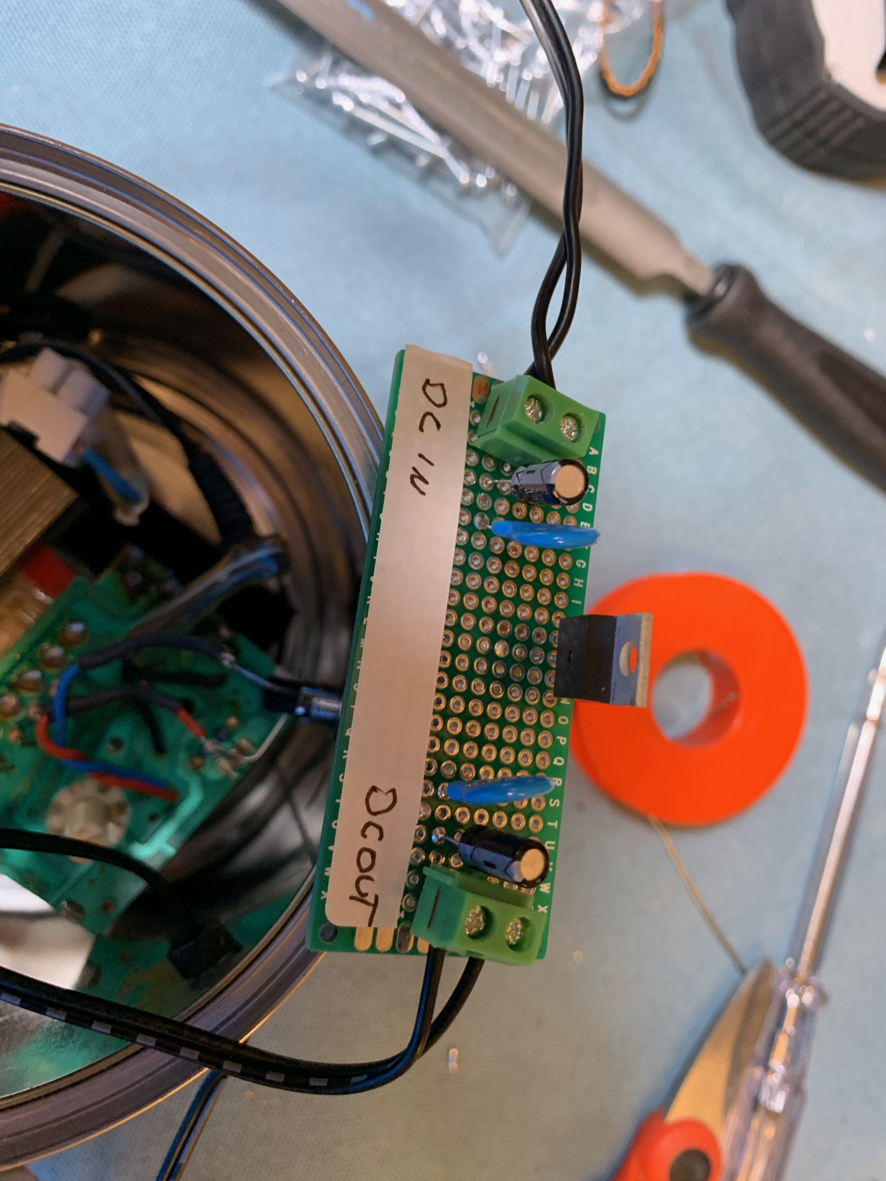 Cosi' ho riciclato un barattolo di cialde di caffè', montato due mini PCB con 7809 con filtri maggiorati con i 12V in ingresso. Sono due per dividere le sezioni dei pedali tra "in-line" tra chitarra ed ampli e "FX loop". Non so se ha senso ma mi piaceva l'idea.