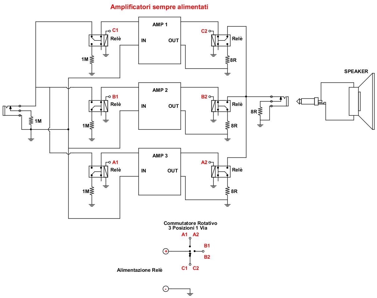 Amplificatori sempre alimentati solo se devi fare una commutazione veloce, altrimenti accendi quello che ti serve quando lo commuti
