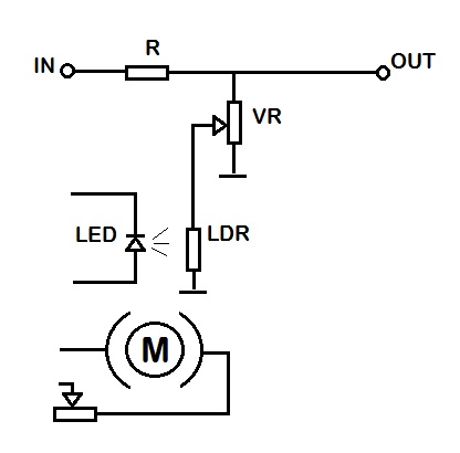Beh, il fotoaccoppiatore potrebbe sostituire il led e LDR del tuo schema, però sarebbe tutto da provare, non so dirti se veramente funziona, probabilmente un vactrol autocostruito funziona meglio. O forse, ancora meglio, lasciare il motorino che è più creativo.
