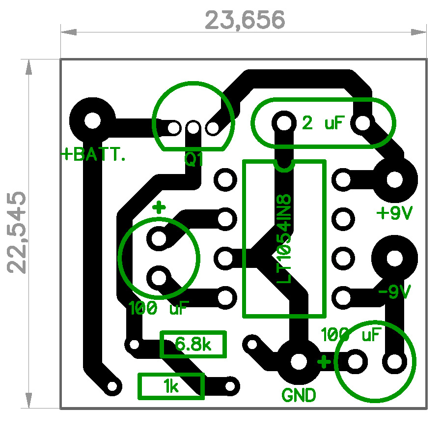 Per lo stesso motivo ho piazzato un 2 uF tra il +9V e GND dell' LT1054 e un cap da 50 pF che fa da passa basso all'ingresso dell'opamp.