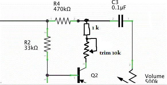 Per il problema del fischio sul pot fuzz al massimo, potrebbe aiutare mettere un condensatore tra base e collettore del transistor vicino alla resistenza da 33k?