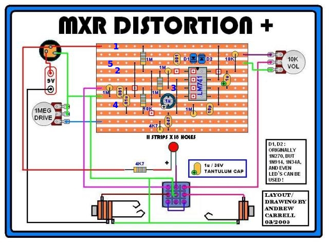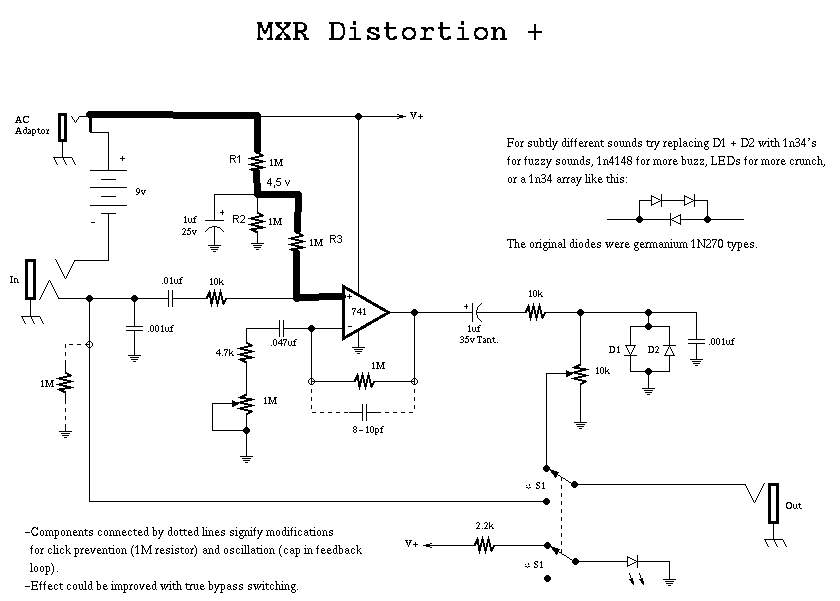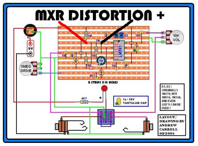 Nel caso del tuo schema la main street del segnale è input, pin3 ic, pin 6 ic fino al pot volume e out. La parte superiore dello schema dove c'è l'alimentazione è un partitore resistivo per dare la "pappa" giusta all'ic, con un condensatore per stabilizzare, la parte sotto l'ic dove sta il pot gain è il circuito di feedback che regola la quantità di distorsione e la parte a dx dove stanno i diodi è la sezione tosatura segnale che serve a "personalizzare" il sound con la tosatura tipica del tipo di diodo usato (si possono infatti fare modifiche con diversi tipi di diodi per avere suoni diversi, ma questa è un'altra storia).