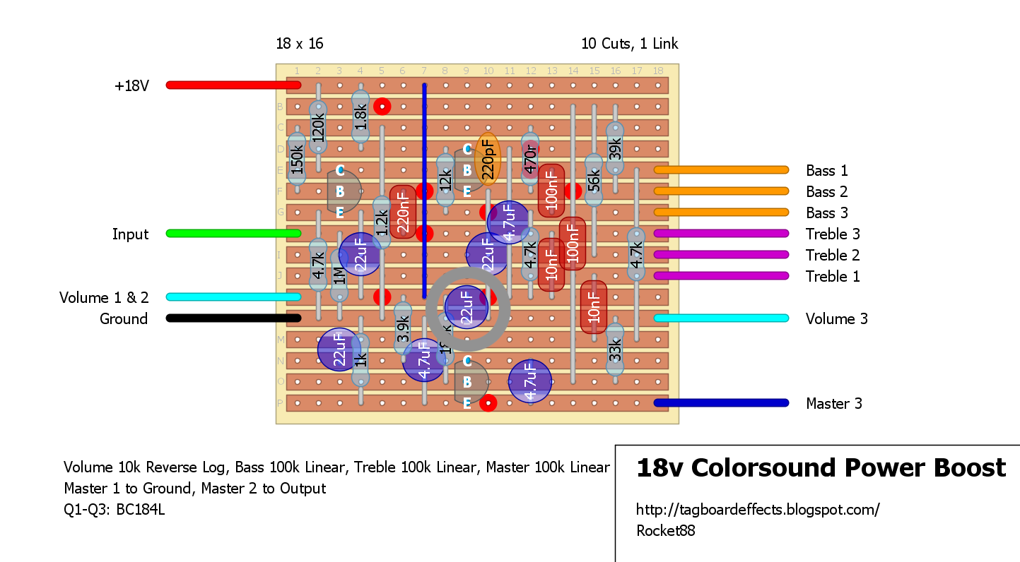 C'è nel layout un condensatore da 22uF, quello tra massa e 18v (segui il tracking sul layout e magari dai un'occhiata allo schema), che fa da filtro per i rumori dovuti all'alimentazione. e 22uF è un valore minimo, la maggior parte delle volte nei pedali lo troviamo da 47uF a 220uF. In questo layout troviamo un 22uF come da schema originale, presumo, e forse il pedale veniva alimentato con due batterie, mi pare? L'alimentazione con le batterie non dovrebbe dare rumori di fondo di quel tipo, al contrario dell'alimentatore.