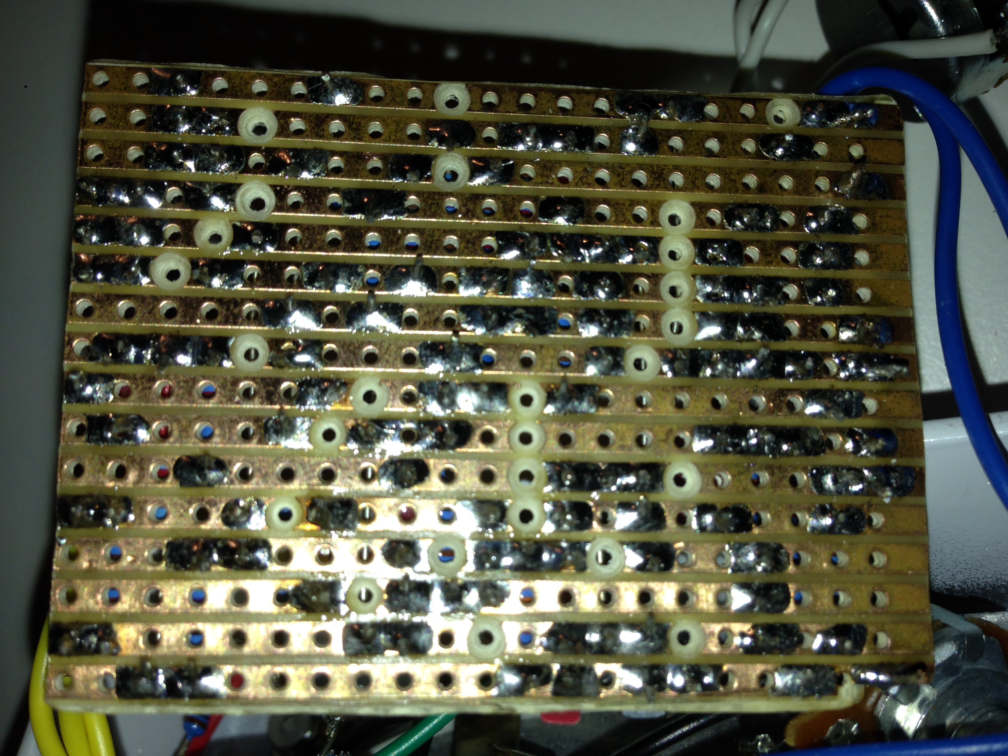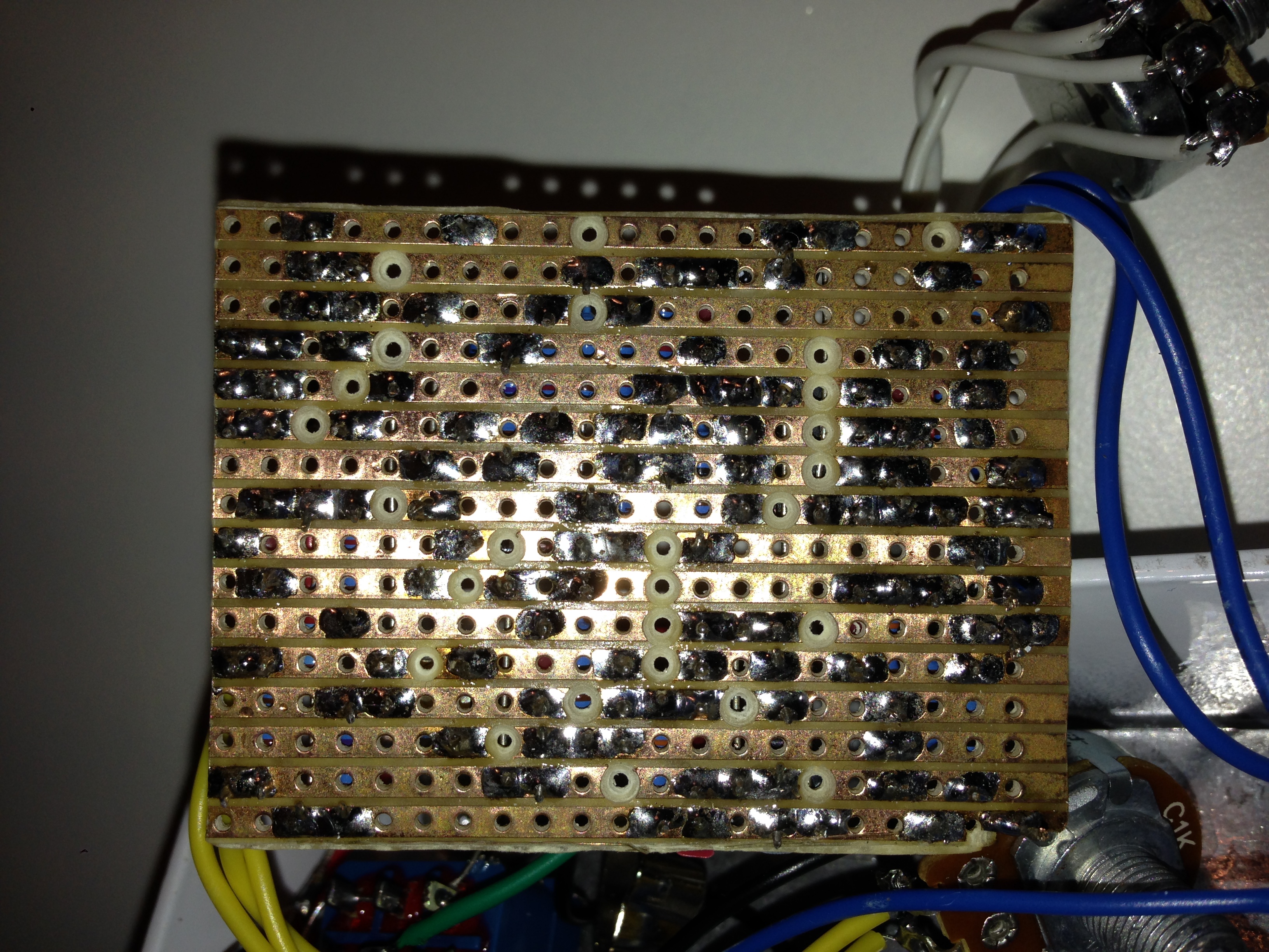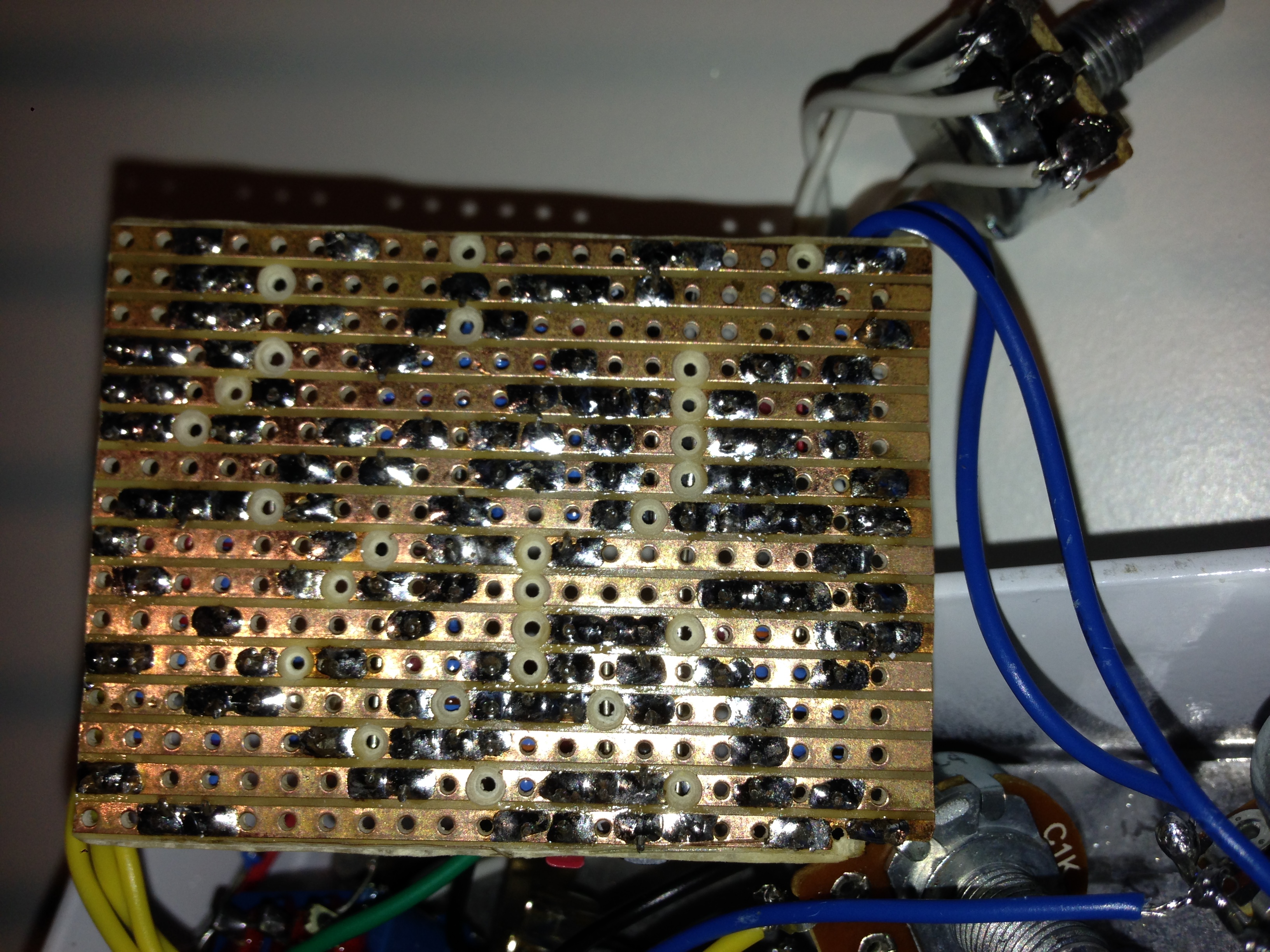 I bordi interni del box potresti coprirli di nastro isolante là dove son a contatto con la scheda. Spero ti sia abbastanza chiare che se due saldature toccano entrambe un potenziometro quest'ultimo faccia da conduttore e mette in contatto quei due punti che chiaramente non dovrebbero esserlo.