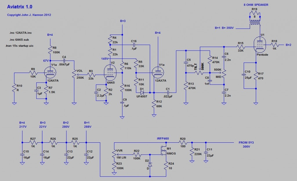 Non ho neanche specificato, le valvole sono un 12ax7 per il pre, e una 6aq5 per il finale, si tratta praticamente di una 6V6 leggermente depotenziata, ha infatti 7 pin ed è piu piccola per cui dissipa di meno.. da questa ci si può tirar fuori all' incirca 3W...anche troppi per suonare a casa mia :gui2: