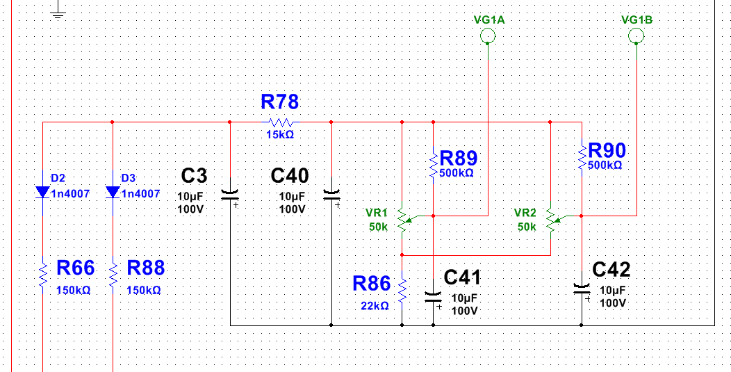In questo modo dovrei avere un massimo di - 74V e un minimo di - 27V come regolazione di bias per ogni valvola. Avrei una regolazione che del +/- 30% di 42,3V.