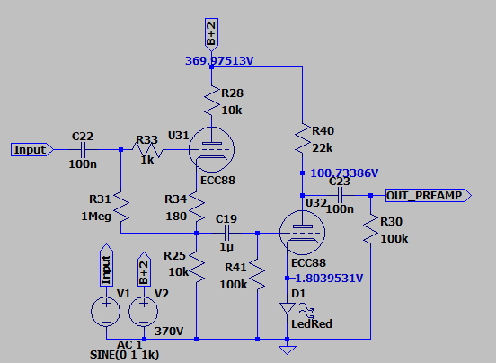 La ECC88 ha un costo simile alla 12AT7, una ri intorno a 2k (quindi ampiamente sufficiente per un carico di 50k), ed in questa configurazione ha un guadagno di 28 dB (cioè saturiamo il finale con circa 700 mVrms nel loop)...