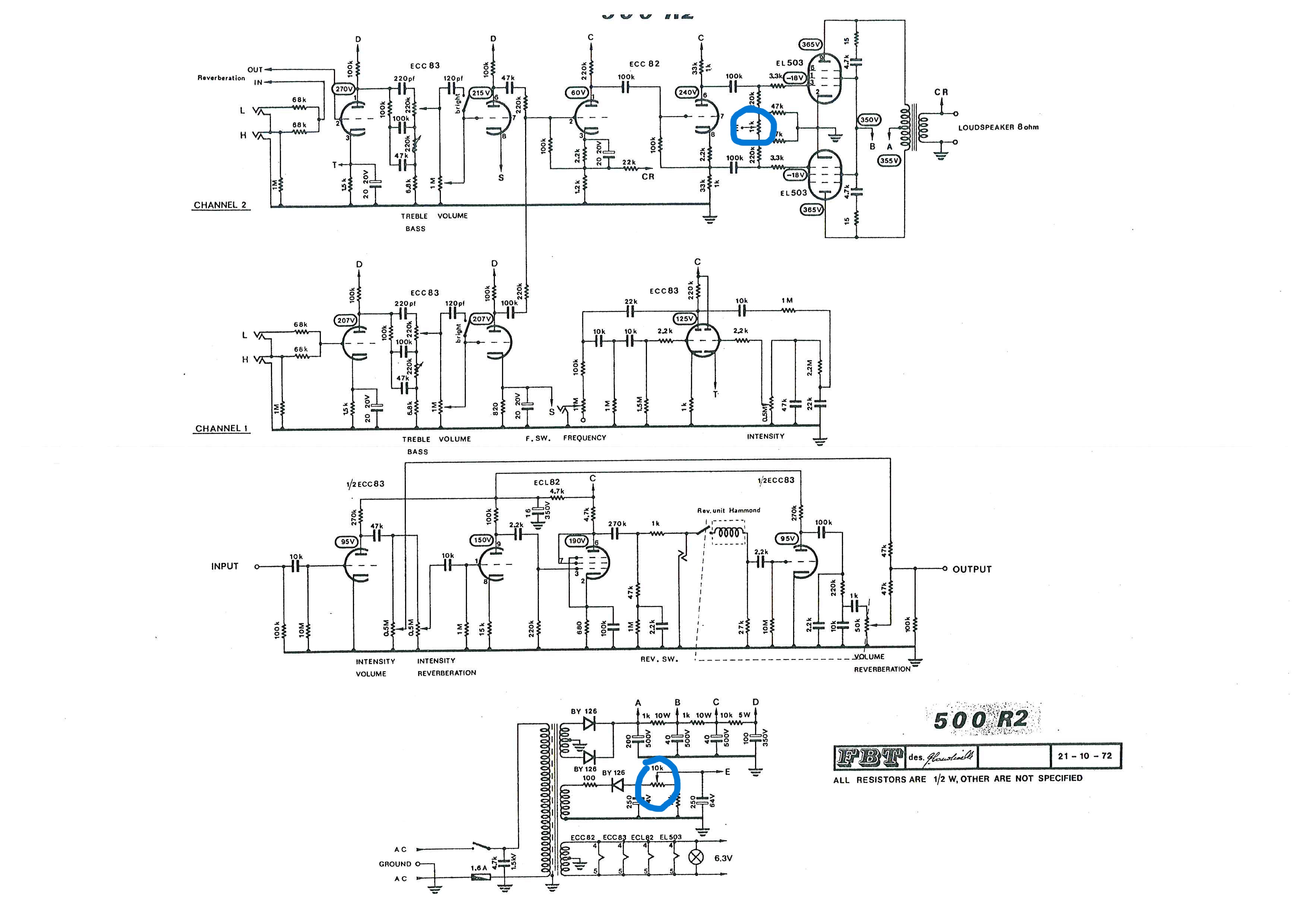 Sull'FBT 1200R ci sono 360V di anodica con -20V per il Bias ma sui catodi ci sono due resistori da 20R (su 4 finali), ne dedurrei che il 1200R non è un Fixed Bias ma un Mixed Bias, visto che per la configurazione Cathode Bias il resistore al catodo è da 56R (per due valvole con 275V di anodica)