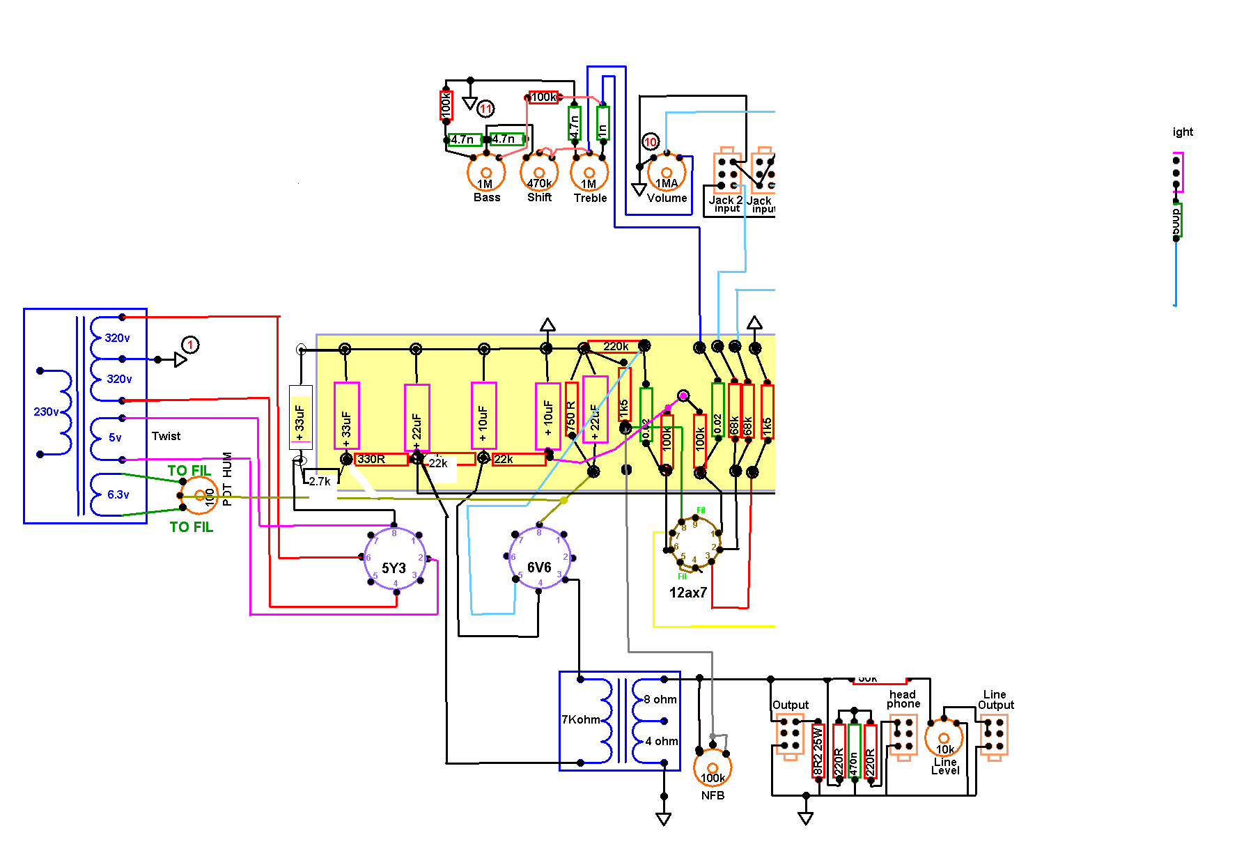 ho sostituito al posto dei 10 k da schema una resistenza da 22k. ed aggiunto un'altro filtro rc. le resistenze sui filtri, sono tutte da 5 w. suono pulito, valori di tensione vicini agli standard del nuovo champ, sul cavo del TU ho 300 v, sugli anodi della pre 130-140v. le altre tensioni mi sono scordate di segnarle su un foglietto :mart: