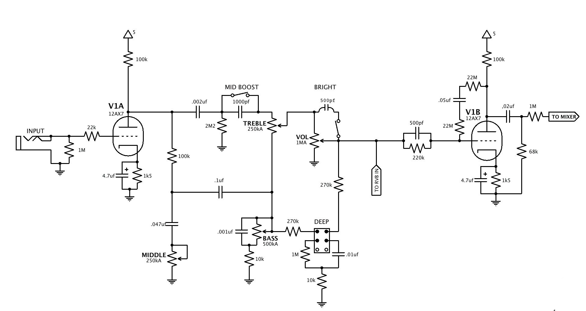 ma fra l'altro mi sto confrontando con un problema... diminuendo la resistenza del NFB se suono un po' più forte non distorce o non si sente affatto, come dei borbottamenti... il suono distorce subito anche se provo a creare un filtro passa alto subito dopo V1b sfruttando il condensatore di disaccoppiamento...