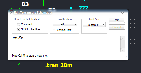 Quando il testo ".tran 20m" è di colore azzurro, la direttiva è solo un testo scritto sullo schema. Quando è di colore giallo, la direttiva è "ATTIVA".